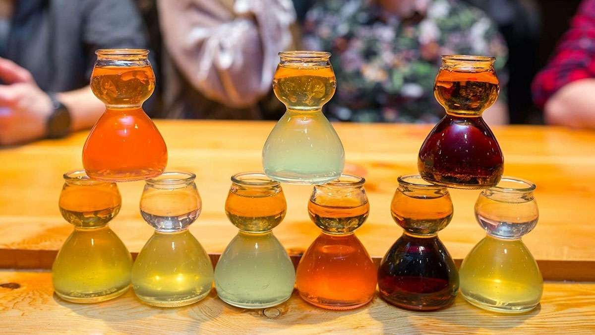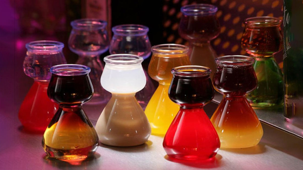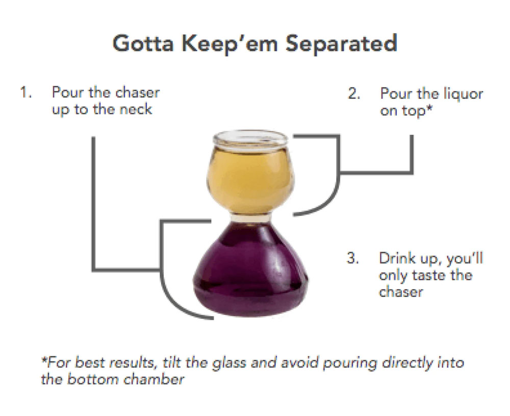 Quaffer double bubbles hold 2.25 ounces of chaser in the bottom and 1.25 ounces of liquor on top. They come with a recipe card that includes classics such as the Irish Car Bomb and Lemon Drop, plus stranger brews, such as the Shady Lady and Freddy Fudpucker.