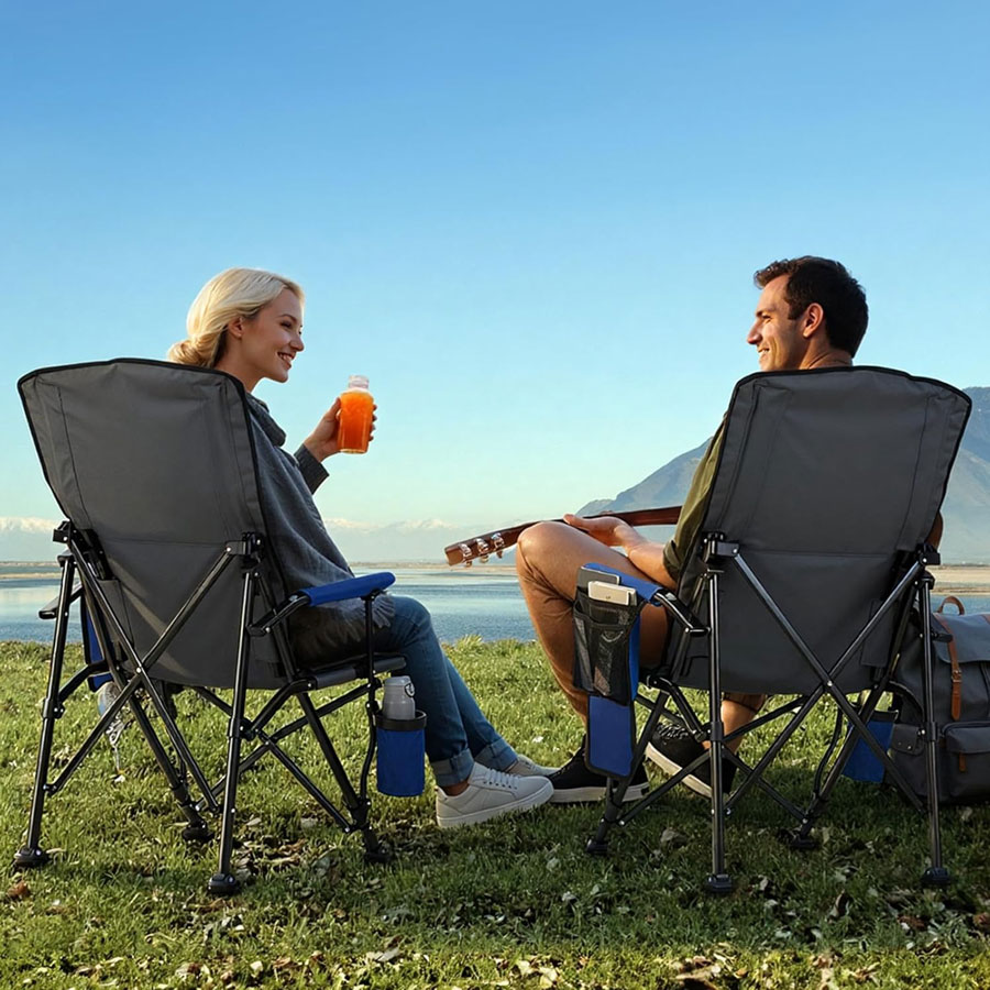 Hot Seat Camping Chairs have a steel tubing X-frame design covered in high-density foam padding and 600DPE waterproof polyester. The 27.6" high seat back is adjustable up to 136 degrees, and supports weights of up to 450 pounds. In addition to packing the heat, the chair also packs a side pocket, a cup holder, and down into a 40" x 8" cylindrical carrier.