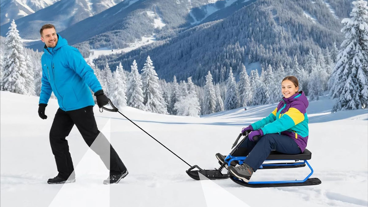 The steerable slow sled is recommended for anyone 13 and up, with a weight capacity of 330 pounds. It also comes with a 6.6' tow rope for those who just want to be zipped along frozen lakes and snowy flatlands by enthusiastic Bernedoodles and younger brothers.